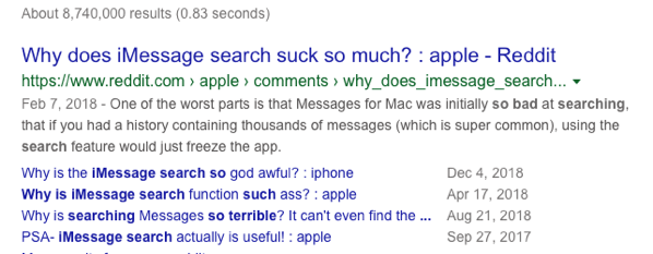 The inability to use the Messages app on the Mac to search message history is really a nuisance. That, and I’m noticing Spotlight search in general seems to really be crappy lately. I wrote this a while back which seemed to kickstart Spotlight back to life: